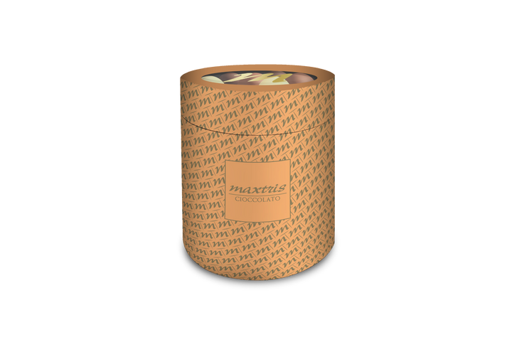 Il Cilindro Mix Nocciola da 600g contiene un assortimento di nocciole tostate ricoperte di cioccolato bianco, al latte e fondente, contenuti in un elegante cilindro.