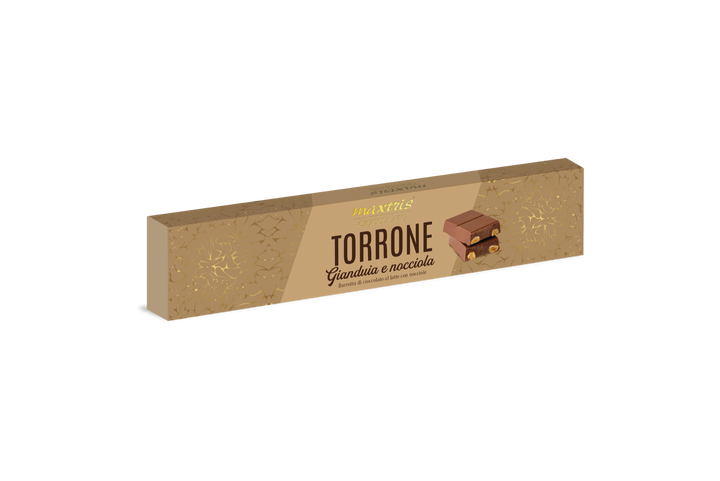 Esplora un gusto unico ed esclusivo quello del Torrone al Cioccolato al Latte e alle Nocciole Gianduia con Nocciole intere Tostate.