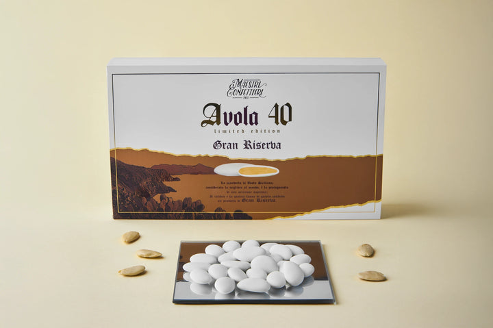 La Mandorla di Avola Siciliana, considerata la migliore al mondo, è la protagonista di una selezione suprema. Il Calibro 40, il sottilissimo strato di zucchero e la qualità, fanno di questo confetto un prodotto da Gran Riserva.